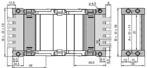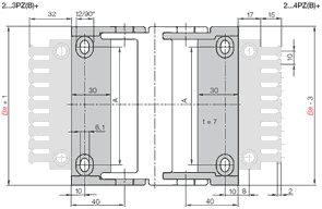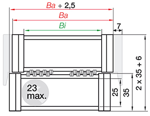 Let op: naast de uitwendige breedte van de kabelrups, moet er 14 mm worden toegevoegd voor de breedte van de twee glijelementen!