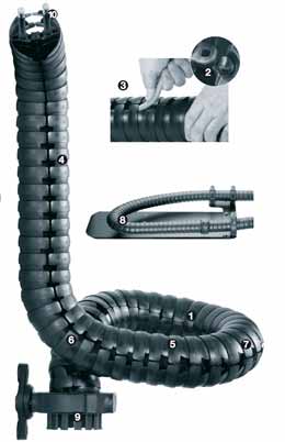 1. Multi-dimensioneel beweegbaar - Hoge flexibiliteit in complexe bewegingen, zelfs in de 6e as. Rotatie van ca. ± 10° per kabelrupsschakel mogelijk op de lengteas. Dit faciliteert kabelgeleiding rond moeilijk geometrische vormen