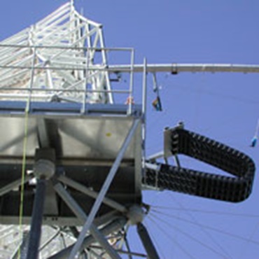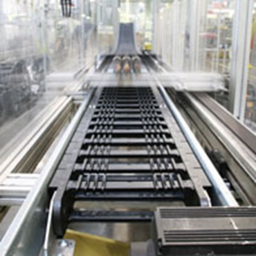 e-kette® in einem Regalbediengerät Auch spezielle Produkte, z.B. für Regalbediengeräte, werden getestet. So z.B. das System guidelok slimline F, welches ein Ausschwingen der e-ketten® in Regalbediengeräten verhindert.