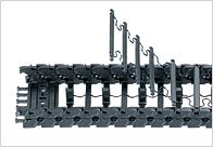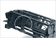 Chaîne Porte-Câbles en trois pièces avec de nombreuses idées nouvelles - le Système E3 d'igus® combine petit pas, fonctionnement régulier, faible niveau sonore, stabilité, montage simple et économie. L'élément à ressort assure la liaison à la place du système à téton / alésage et évite les mouvements entre les articulations. Ainsi, la Chaîne est quasiment exempte d'usure (salles blanches). Pour réduire les frais de fabrication et de montage, la bande ressort n'est pas sous forme de pièces individuelles mais montée sur une longueur de dix maillons.
