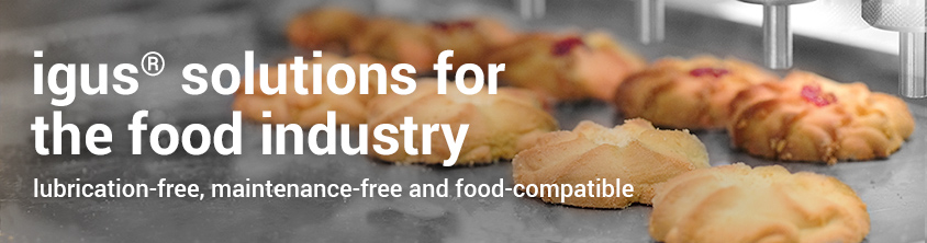 In order to comply with the strict requirements for food hygiene and food safety in all stages of a process, igus® supplies you with plastic solutions for your food-processing machines and equipment. As these machine components have been specially developed for moving applications and do not require any lubrication, product contamination is ruled out completely.