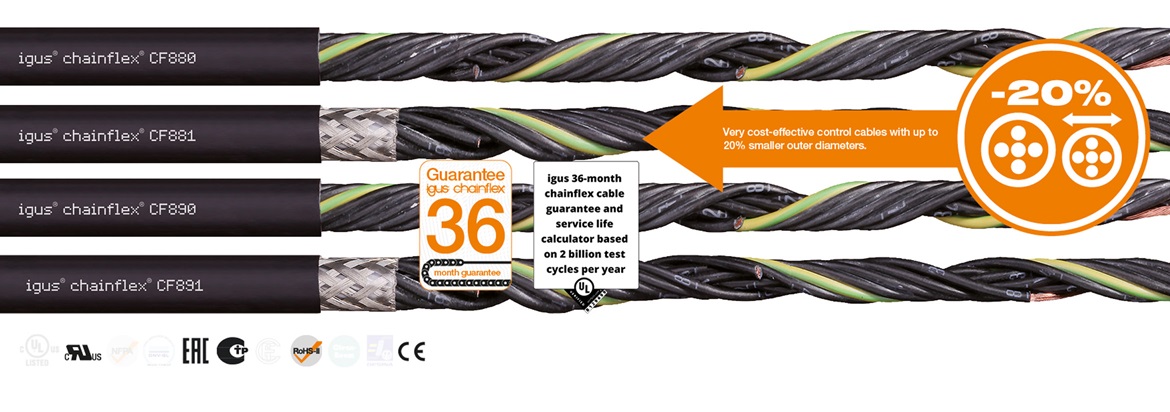 Les câbles ont été dotés d'une fine isolation en TPE qui a permis d'en réduire le diamètre extérieur. De ce fait, ils peuvent être utilisés dans des espaces plus petits. Ils ont bien entendu été testés tous azimuts dans le laboratoire chainflex et bénéficient de la garantie chainflex de 36 mois.