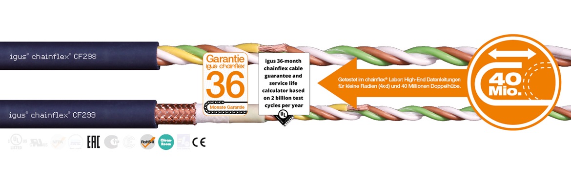 Les conducteurs en cuivre des câbles courants arrivent rapidement à leurs limites mécaniques sur les applications dynamiques à tout petits rayons de courbure. C'est pour répondre à ce type de problème que la société igus offre maintenant une garantie de 40 millions de cycles pour ses séries de câbles de données CF298 (non blindés) et CF299 (blindés) avec le plus petit rayon de courbure (4xd) pour les câbles de données en mouvement dans des chaînes porte-câbles. Cela a été possible grâce à la combinaison entre l’alliage hautes performances conducteur et la gaine extérieure igus en TPE très résistant à la flexion qui permet d’éviter fissures et ruptures.