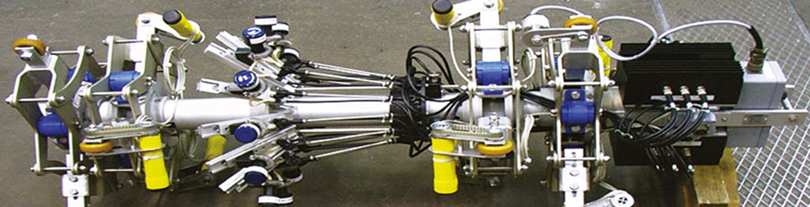 Die Bolzen der Gelenkverbindungen sind in iglidur Kunststoffgleitlagern gelagert. Die Lager übertragen reibungsarm und stick-slip-frei zuverlässig die hohen radialen Zentrierkräfte und minimieren durch ihren integrierten Anlauf die Reibung im Armsystem. Herzstück der Sensorverstellung sind Gleitführungen und Spurstangen. Jeder Einzelsensor ist auf eine eigene drylin N Miniatur-Gleitführung montiert. Der Gleitschlitten ist über eine justierbare Spurstange an die Zentralverstellung gekoppelt. Die Spurstangen bestehen aus igubal Gelenkköpfen mit Rechts- bzw. Linksgewinde. Als Gegenlager dienen beidseitig Gabelköpfe.
