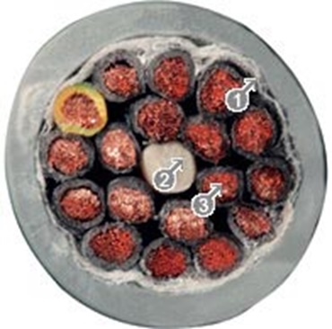 Du fait du toronnage multiple des conducteurs, tous les conducteurs changent à une même distance plusieurs fois du rayon intérieur au rayon extérieur dans la boucle du câble. Par conséquent, les forces de traction et d‘écrasement se trouvent compensées autour du noyau particulièrement résistant à la traction qui procure à la structure du câble la stabilité intérieure requise. C‘est ainsi que le toronnage demeure stable, même en présence de contraintes par courbure maximales voir photo 3.