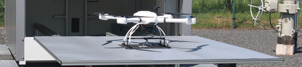 Drohnen-Hangar mit Plattform Der Quadrocopter HD 4-1100 vor dem Inspektionsflug: An Bord eine spezielle Mappingkamera