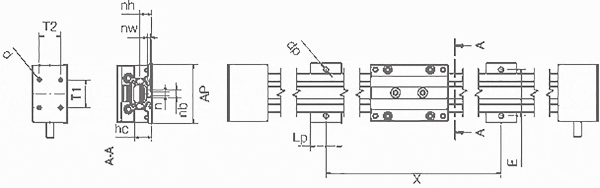 | Bestellnr. | lt ±0,3 | sg | ha | lz | l2 | d2 | X | E ±0,2 | AP -l | LP | dp | n | nb | nw | nh | T1 | T2 | d |